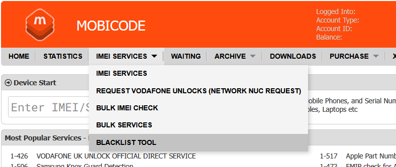 1. In the web portal, navigate to IMEI SERVICES and then click on BLACKLIST TOOL.