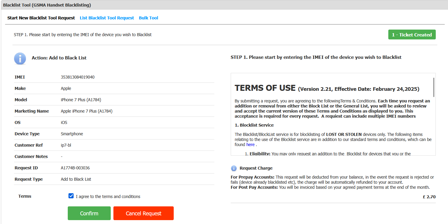 4. On the next page, you will be presented with the T&Cs and cost of the Blacklist entry. Click the check box to confirm the T&Cs, and then click Confirm.